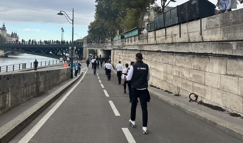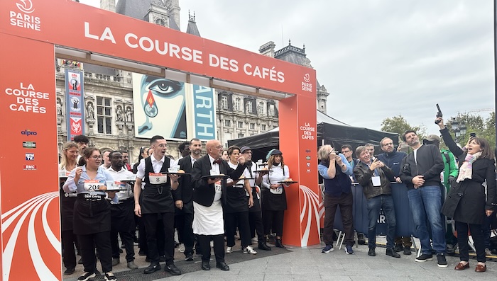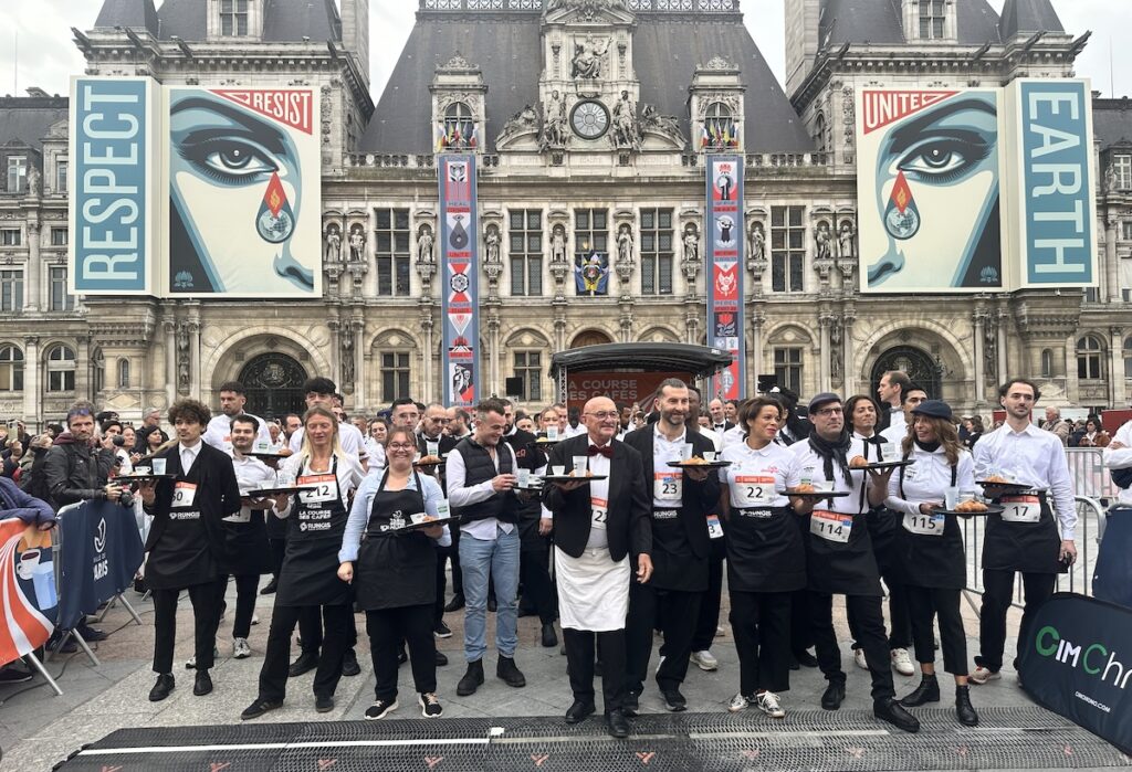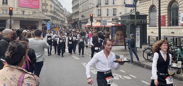 Each participant carried a tray with a cup of coffee, a glass of water, and a croissant. Running was strictly forbidden; only walking was allowed. The rule humorously underlined a simple truth — a Parisian waiter walks an average of 17 km a day.